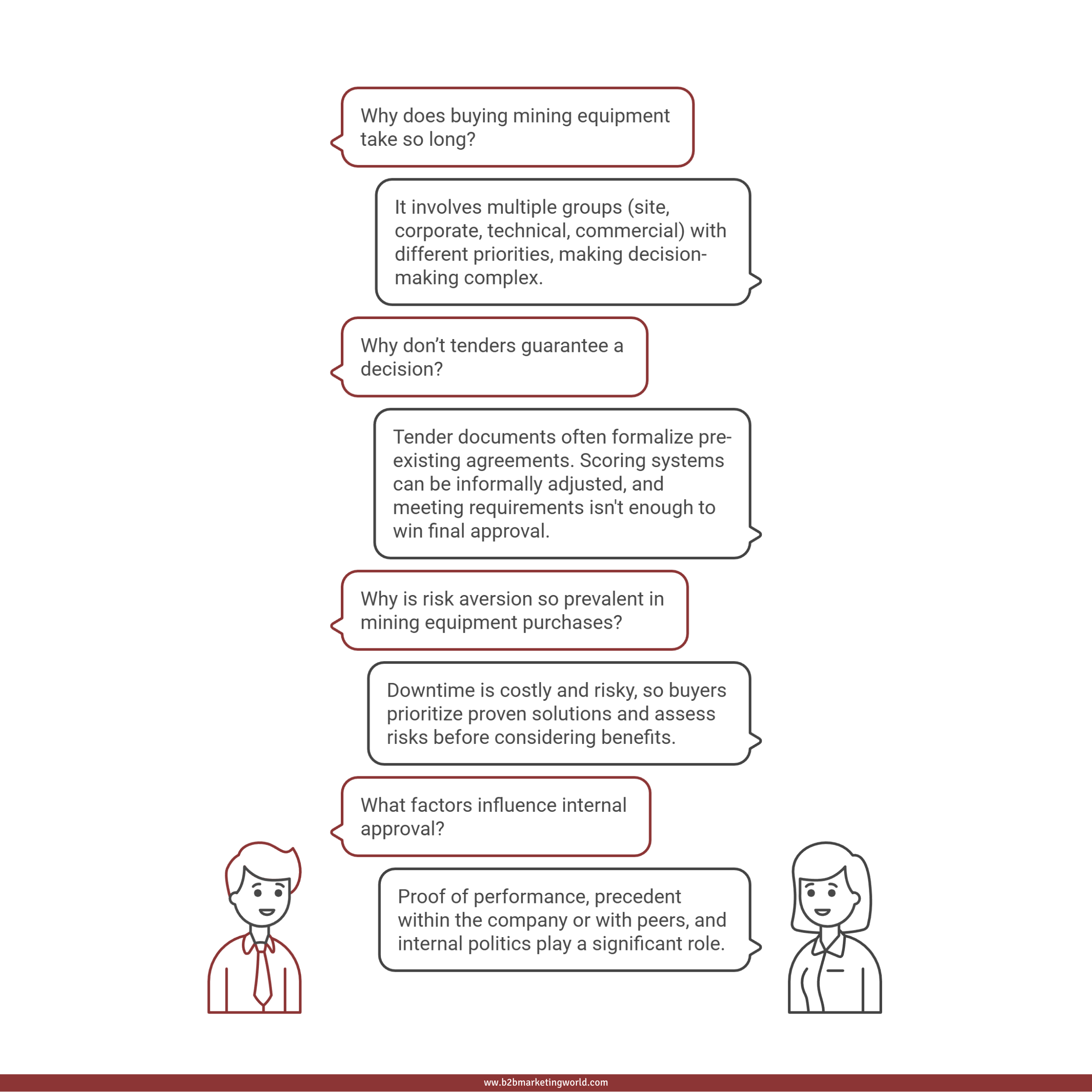 In mining companies, authority is spread out across site operations, corporate leaders, technical teams, and procurement, making the process cautious by nature. Decisions only move forward if they can stand up to review from HSE, engineering, finance, and operations.